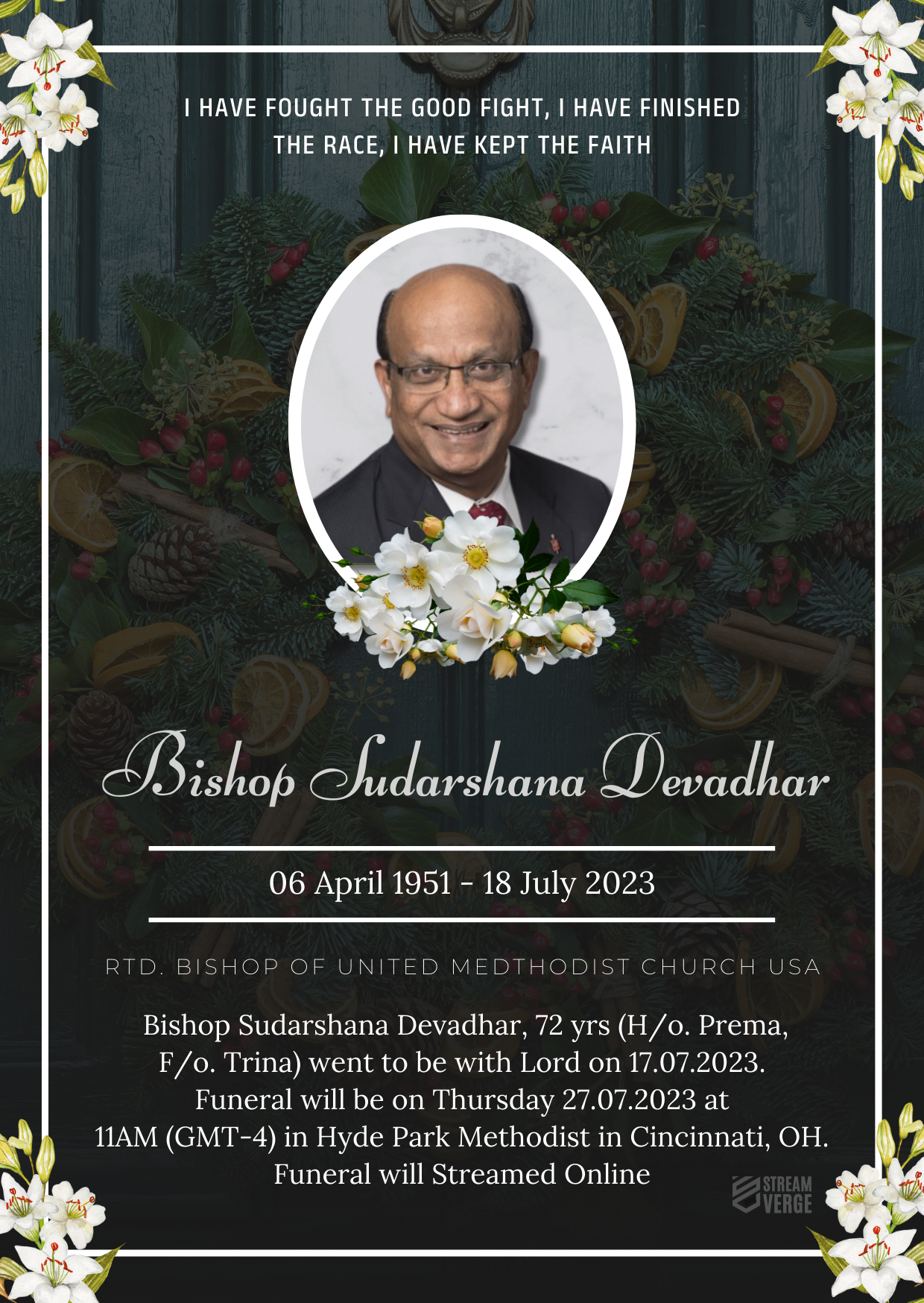 Bishop Sudarshana Devadhar leaves behind a cherished family, including his wife, Prema, their daughter, Trina, son-in-law Gage, and his beloved grandchildren. As we come together to honor his memory and celebrate his life, a funeral will be held on Thursday, July 27, 2023, at 11 AM (GMT-4) in Hyde Park Methodist in Cincinnati, OH. For those unable to attend in person, the funeral will be streamed online, allowing people from around the world to pay their respects and bid farewell to this remarkable leader.