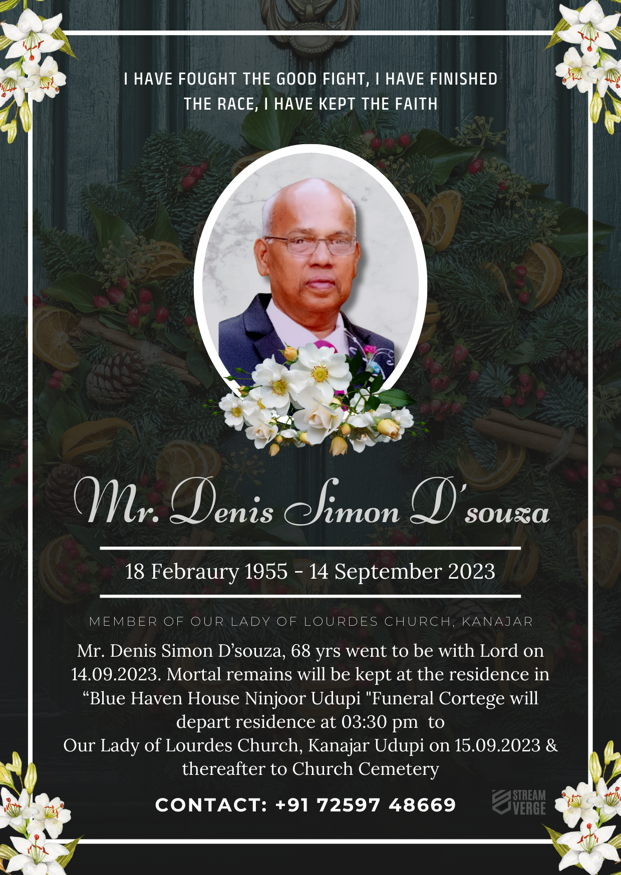 To honor Denis’s life and bid him a fond farewell, the funeral cortege will leave from his residence at Blue Heaven, Ninjoor, on Friday, September 15, 2023, at 3:30 pm. Friends, family, and well-wishers are invited to join the procession, which will lead to Our Lady of Lourdes Church, Kanajar, where a solemn Mass will be held at 4:00 pm.