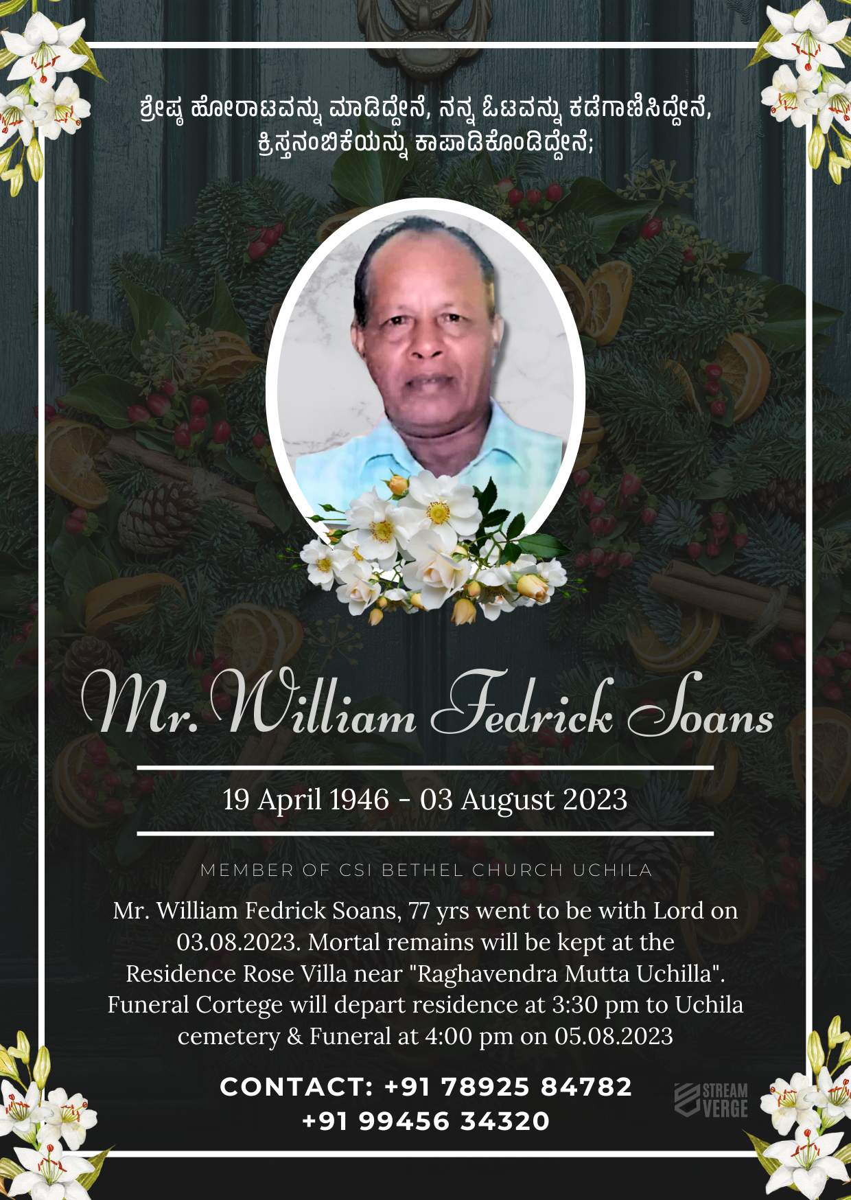 A gentle soul has found his eternal rest. It is with profound sadness that we announce the passing of Mr. William Fedrick Soans, a beloved member of CSI Bethel Church Uchila. On the 3rd of August, 2023, at the age of 77, Mr. Soans peacefully left this world to join the Lord, leaving behind a legacy of faith, kindness, and love.