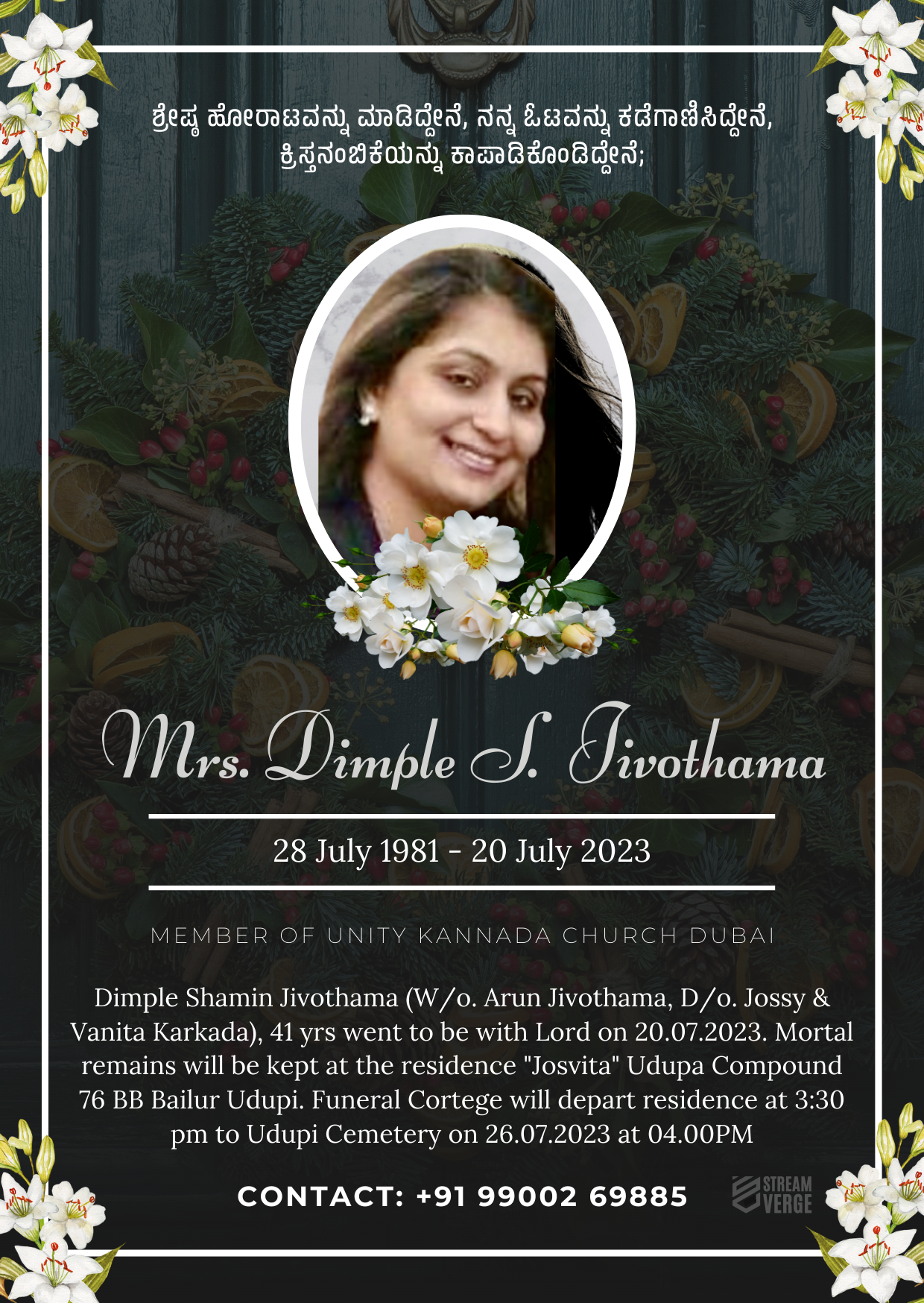 On the 26th of July, 2023, at 4 pm, we will gather at the UBMC cemetery in Udupi to bid our final farewell to this extraordinary soul. The funeral service will take place at the UBM Jubilee Church Udupi, a place where Dimple found solace in her faith and where she offered guidance and love to many.
