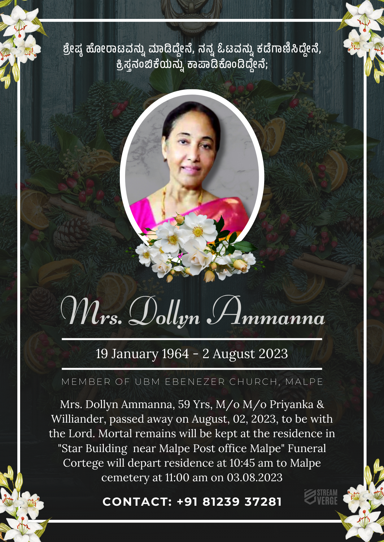 Dollyn’s life will be celebrated on August 3, 2023, at 11:00 AM at the serene Malpe cemetery. The funeral service will be held at the UBM Ebenezer Church in Malpe, a place that held a special significance in her heart.