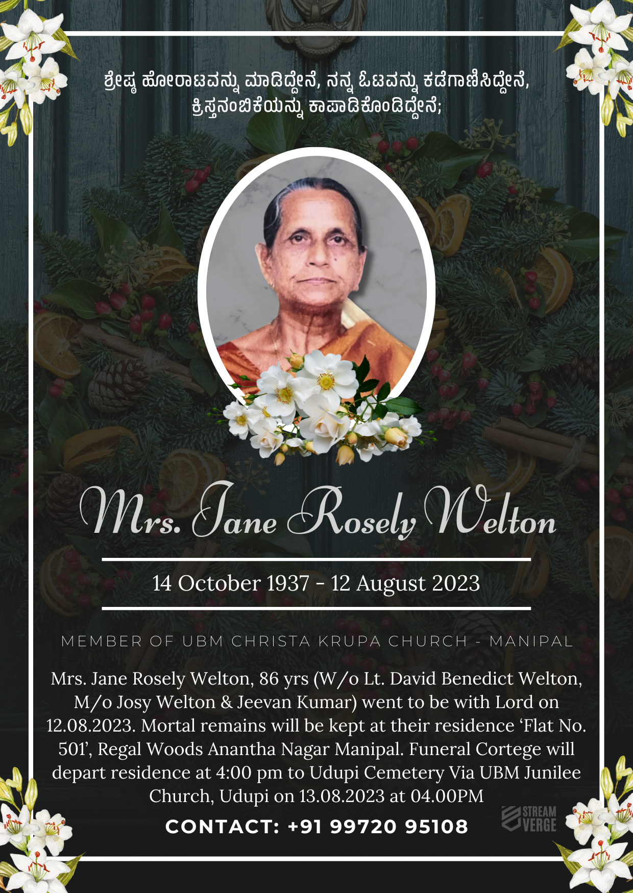 With heavy hearts and tearful eyes, we gather to bid farewell to a beloved member of our UBM Christha Krupa Church family. Mrs. Jane Rosely Welton, aged 86, passed away on August 12, 2023, to join her Heavenly Father, surrounded by her loved ones. She was the devoted wife of the Late Mr. David Benedict Welton and the loving mother of Josy Edwin Welton and Jeevan Joseph Kumar.