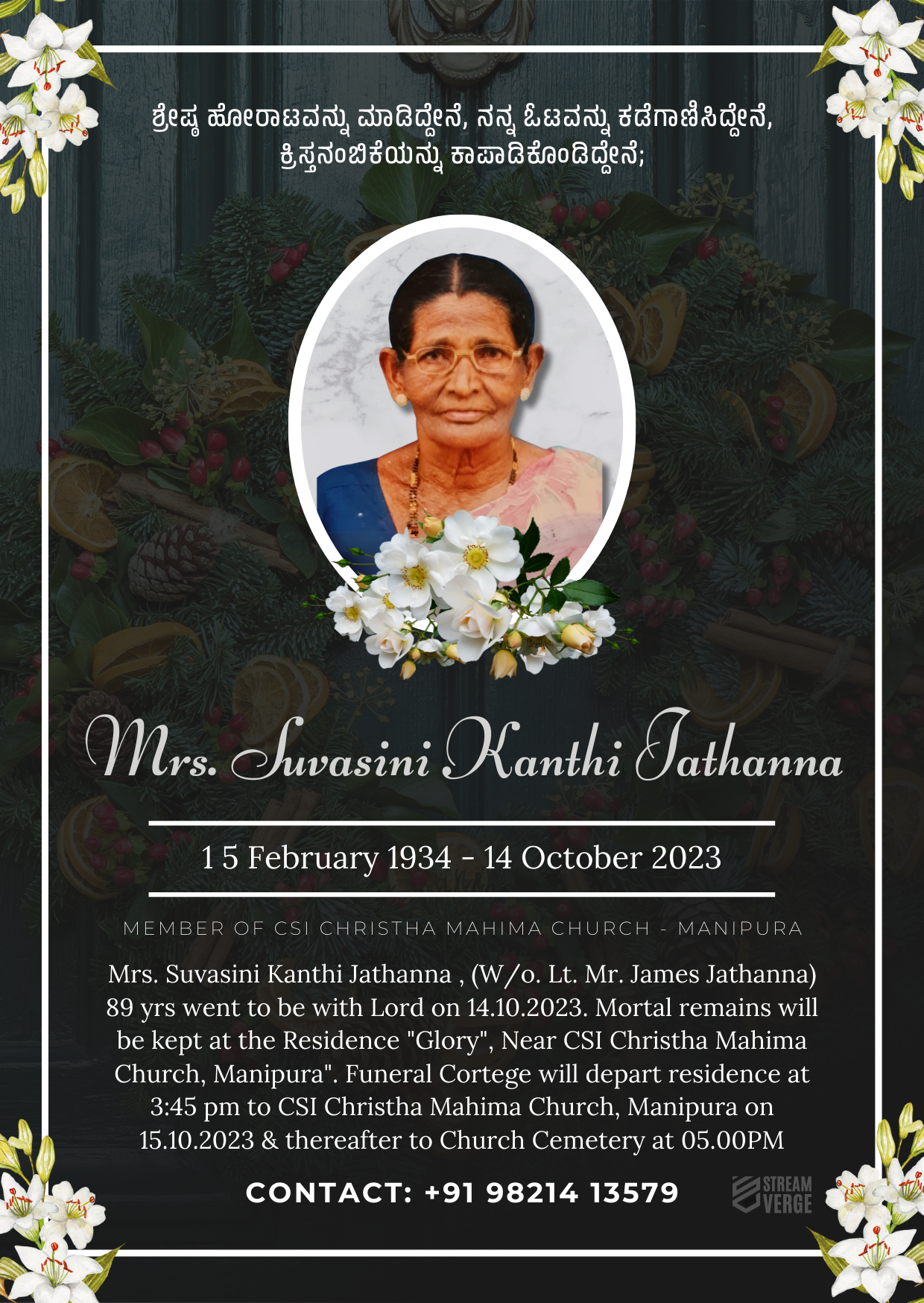 A solemn funeral cortege will depart from the residence at 3:45 pm on the 15th of October, 2023, and proceed to the CSI Christha Mahima Church in Manipura. The final rites will be conducted at the Church Cemetery at 5:00 pm on the same day, where Mrs. Suvasini will find eternal peace beside her late husband, Mr. James Jathanna.